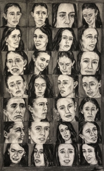 The dark and light, grey and whites created by the heavy lines and smudges of the charcoal lends a dramatic expressive quality to the images.